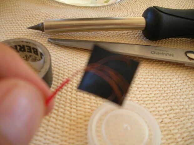 Haga un pequeño agujero en la parte superior de las botellas de golpear con un objeto punzante (más tarde se utilizará para el cable). Luego poner el otro trozo de papel de aluminio en el interior de la botella como en la segunda foto. Cinta para no salir como en la tercera foto. Luego tomar el otro cable y cinta adhesiva en el interior de la botella.