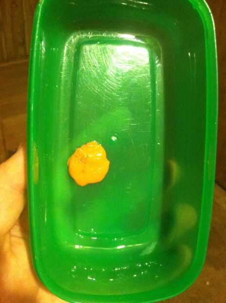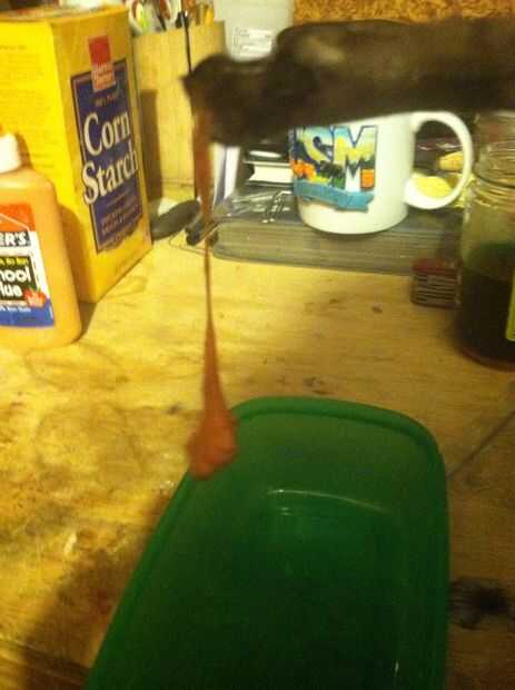 Echar pegamento en el tazón de fuente (pour cuanto necesita, pero recuerde más grande del lote es más difícil) y añadir el detergente un poco a la vez a medida que mezcla. Detendrá cuando se parece a la imagen. Tendrás que trabajar el detergente en el pegamento, puede que tenga que utilizar su mano, debe llenar como Baba pero más denso.
