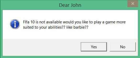 Para enmascarar el error como una aplicación o un juego, simplemente copie el archivo vbs algunos donde (excepto el escritorio) y hacer un acceso directo del archivo en el escritorio. Cambie el nombre a... vamos a decir FIFA 10 y utilizar un icono similar. Cuando alguien abre el juego, producirá un error diciendo que son un gran douchebag:-p