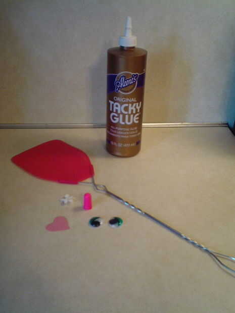 Se reúnen para arriba cualquier basura puede encontrar para Fanny. Si no tienes un matamoscas, probar con una espátula o una cuchara de madera! Mi Fanny tiene una base de matamoscas, una nariz de tapón para los oídos, algunos ojos del meneo, un hairbow y una boca en forma de corazón corte de papel de construcción. Usted puede hacer todas las piezas de cartulina, fieltro, tuercas y tornillos, o cualquier cosa interesante que usted encuentra en la casa o del garaje. Fanny es