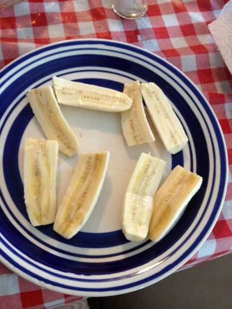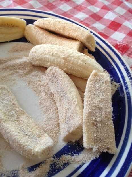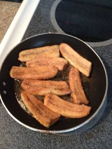 Corta 2 plátanos en un plato (más si se cocinan a más de 4 personas) y rodar en el polvo de yuca y freír en una sartén hasta que comienzo a dar vuelta a marrón. En canela un poco de powedered para un sabor especial.