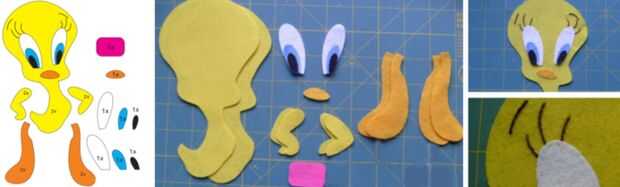 Cortar diferentes piezas de fieltro que coinciden con cuerpo de pato; y un rectángulo para hacer bowknot. Coser los ojos, la boca y las cejas en su cara.