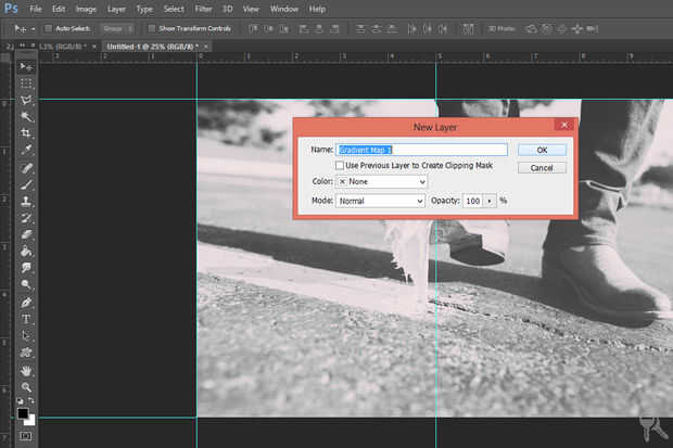 Para hacer este filtro necesitamos hacer otra capa de ajuste. Cambiar los colores de fondo y primer plano como en fotografía. Ahora vaya a la nueva capa de ajuste mapa de degradado de la capa. Esta capa debe estar debajo de nuestra capa de ajuste curvas.