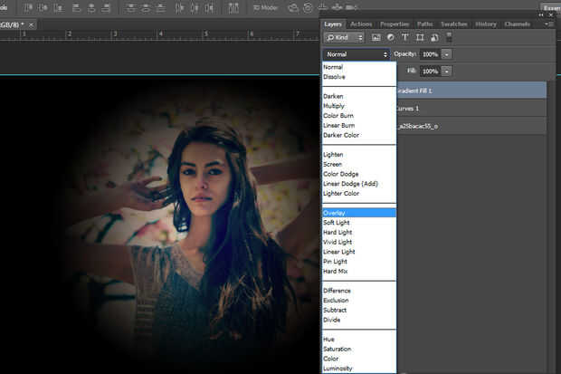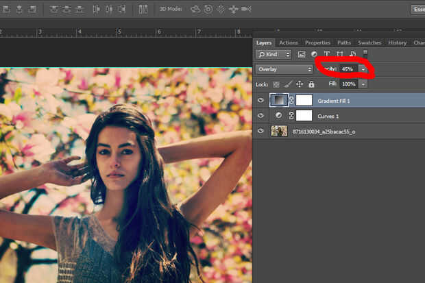 Ahora seleccione la capa de relleno de degradado y cambio de modo a "Overlay" de fusión y cambiar opacidad al 45%. También puede tratar de "Luz suave" modo de fusión y cambiar la opacidad a diferentes valores para el mejor efecto.