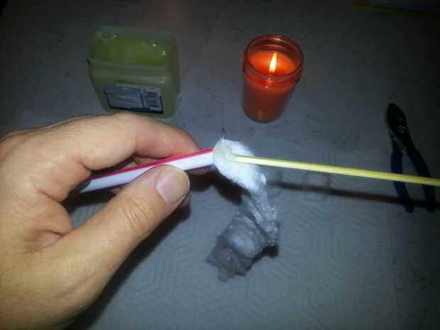 Tomar el pincho y sumerja el extremo plano en la vaselina y obtener tabaco una cantidad del tamaño de guisantes en la punta. Tomar el extremo del rollo de algodón y usar la punta de la brocheta para iniciar presionando el algodón en la paja. Presione alrededor de una pulgada en la paja redip el pincho en la vaselina y empuje en la pulgada siguiente del rollo. Después de cada rollo o pieza, empacar el algodón en la parte inferior de la paja tan ajustadamente como sea posible. Nota: Dependiendo de la paja que está utilizando, debe poder caber 3 bolas de algodón por paja. También, deje en blanco en la paja por lo menos 1/2 pulgada.