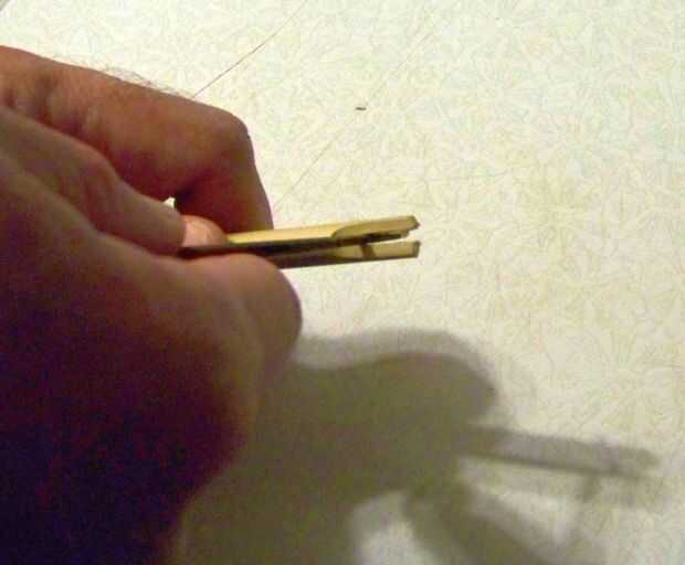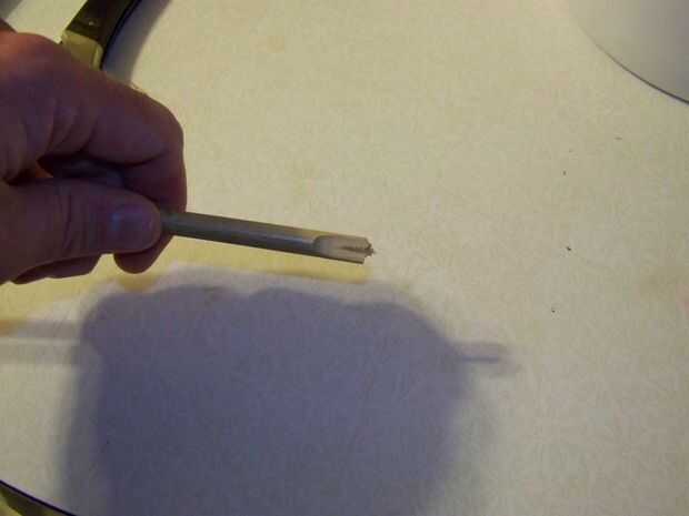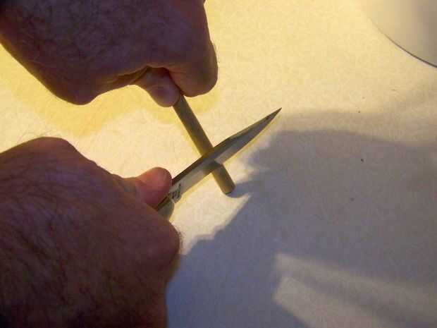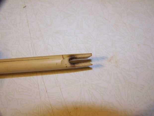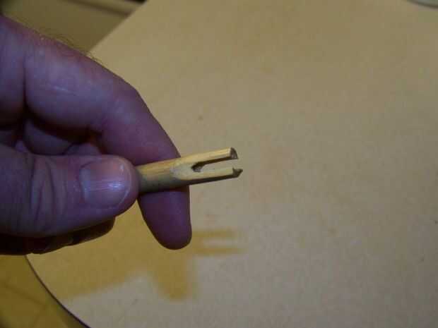 Tome un cuchillo pesado y a partir de cerca de 3/4 pulgada del acto final como usted está afilado de un lápiz. Pero no estamos afilando a un punto. Queremos aplicar un giro a la cuchilla por lo que la mayoría de la corte es paralela al eje. Queremos ir solo lo suficiente para cubrir la cavidad de la médula.