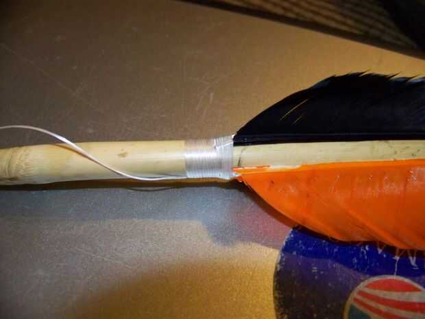 Para asegurar los azotes de la seda dental sin cera se utilizan para pestañas hacia abajo el borde de las plumas remeras, es imperativo que esto se haga, de lo contrario se puede incrustar una pluma en su mano. Los azotes se continuaron hacia arriba como una espiral abierta a lo largo de la pluma, y luego otra azotaina apretada se hace en el nock. Terminar con un clovehitch y un punto de pegamento para mantener ajustada.