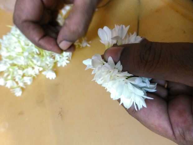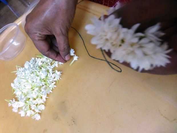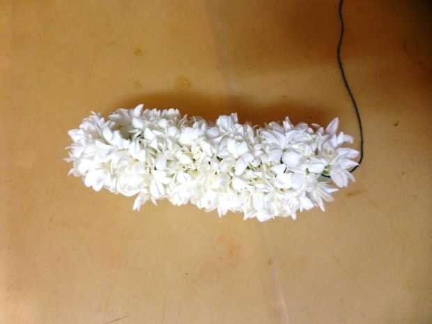 Continuar el tendido hasta la longitud deseada o hasta que haya terminado todas las flores cosechadas, lo que sea cómodo para usted. Una vez que termine, hacer un nudo en el extremo y cortar el hilo extra.