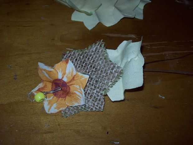 Tomar las tres piezas que ha hecho (la pieza central, los tejidos normales en forma de flor y la arpillera) y cadena en el cable. Dependiendo de cómo desea la flor para ver tienes que cortar enogh de cada uno. Asegúrese de que todas las piezas de tela y la pieza central en el centro al lado del talón.