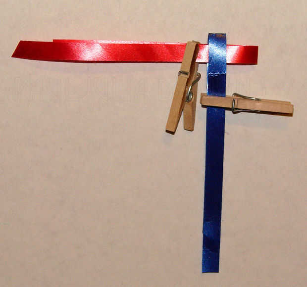 b. ahora, conecte las dos primeras tiras--el rojo y la cinta azul marino--insertando la cinta roja plegada en el lazo de cinta azul marino, como se muestra en la segunda foto.