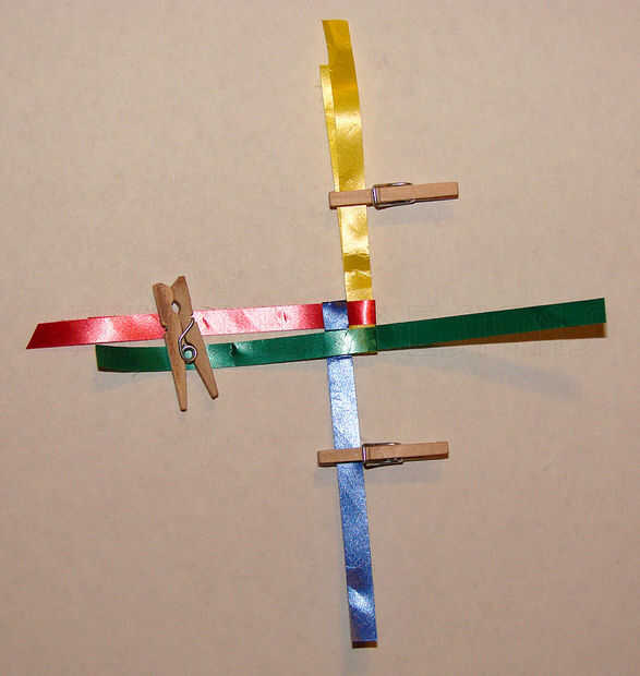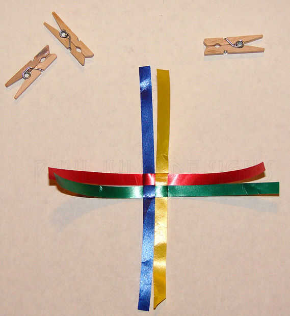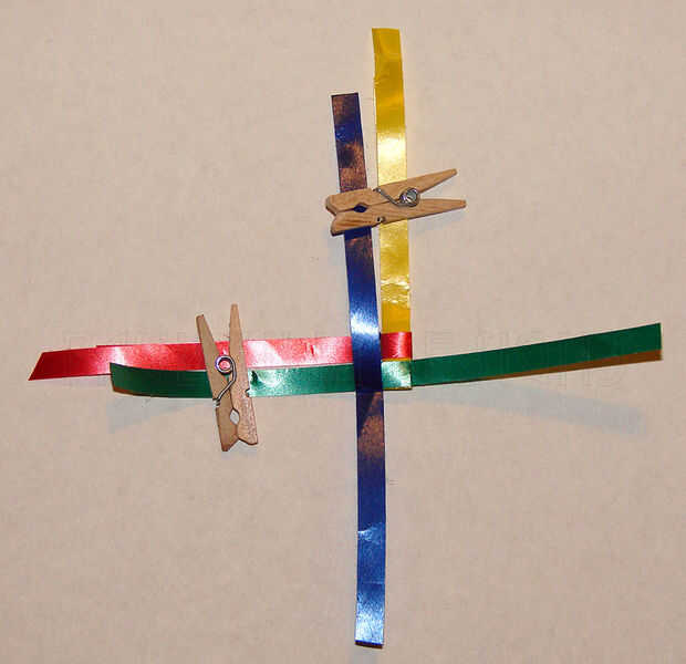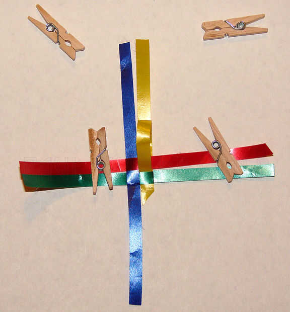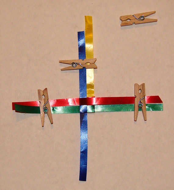 b. a continuación, doblar la tira larga azul marino a los verdes y la marina de guerra azul sí mismo como se muestra en la segunda imagen. (Pongo el pin de ropa encima de las tiras para sujetar en su lugar).
