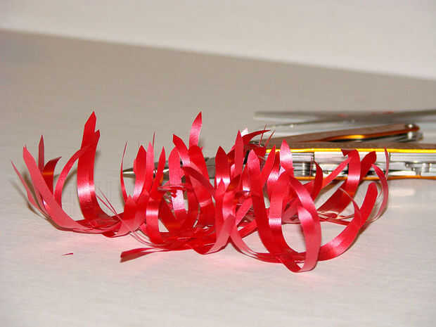Desde que planchar la cinta en tiras planas, los pétalos que curva hacia arriba para hacer una forma floral. Usando el lado de la hoja de las tijeras (o pinzas), colóquelo sobre el principio de los dos primeros pétalos. Con mi pulgar en la hoja y un índice por debajo de ambas cintas para presión, arrastro la hoja. Si quiero los pétalos a encresparse firmemente, antes de llegar a la punta de las tiras, suba el lado de la hoja y arrástrela. La cinta se enrollarán como se muestra. Repita este procedimiento para los otros tres lados de la Asamblea de pétalo del enrollamiento.