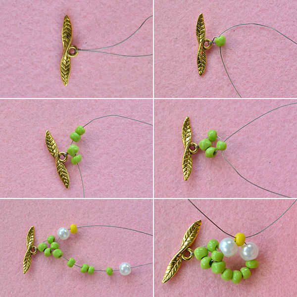 3 º, deslice cinco granos de la semilla verde y un grano blanco de la perla en un lado de un hilo y una tira de perla blanca y un grano de semilla amarilla en otro lado y cruzar el alambre.