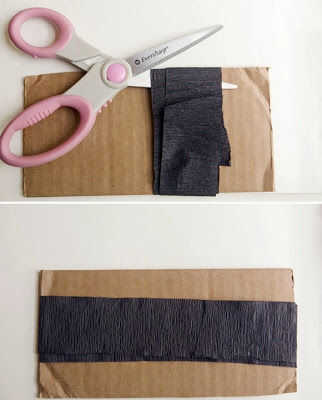 Cortada papel negro con 3cm de ancho, viento en el ancho de la cartulina. Esto se utilizará para el pistilo corto. Bobina de papel a lo largo de la longitud de la cartulina. Esto se utiliza para cortar las borlas de pistilo largo.