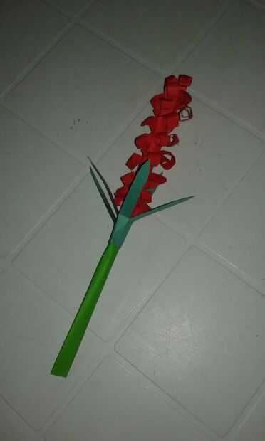 preparaciónPapel rojoCera verde o verde quilling de papelZinc, plástico, hojas y tallosRedondo negro pistilo, blanco perlasTijeras, pegamento de leche, vaso de vidrio, esponjaCortador de florPaso 1: Cortador de flor de uso para cortar 2 pétalos de nu