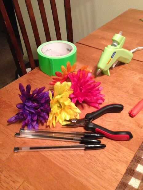 • Falso flores • hi temp. Pegamento caliente pistola verde cinta • plumas • alicates que es todo lo que necesitas!