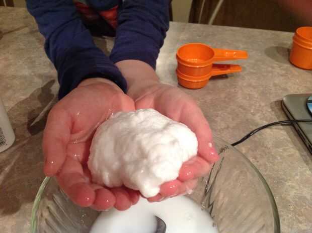 Una vez que se vierte toda la mezcla del bórax, sacar el flubber. Va a ser muy húmedo, pero como se amasa en sus manos, empezará a secarlo. Sólo asegúrese de lavarse las manos después.