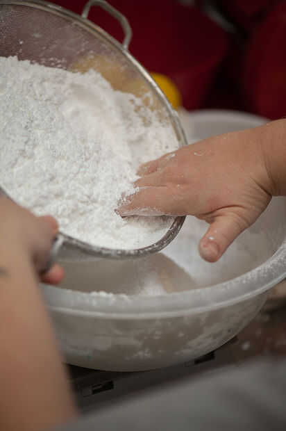 Para tamizar, coloco mi recipiente sobre la báscula, presione tare para quitar el peso de la báscula luego cucharada azúcar en polvo en el recipiente hasta dos libras. Yo uso un colador grande a mi azúcar en la taza. Solo presiono mi mano hacia adelante y hacia atrás para hacer el azúcar pasar por el tamiz.