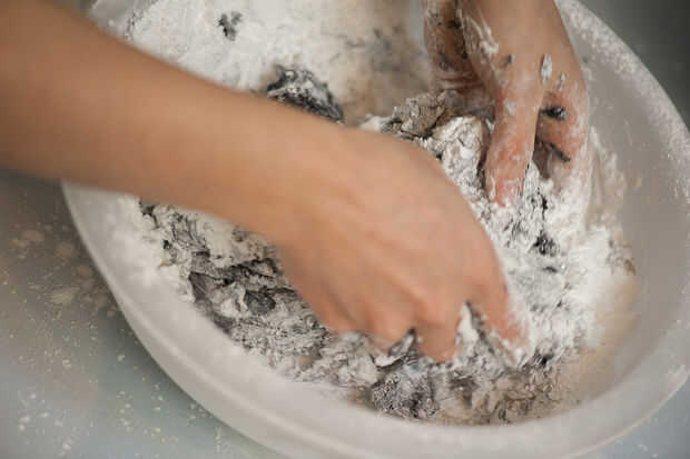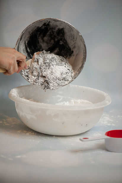 Agregue otra cucharada de azúcar y use una espátula para ayudar a tirar la mezcla de la taza. Raspe en el azúcar en polvo restante en el recipiente y amase hasta que tenga la mayoría todo el azúcar incorporado. No te preocupes si no es todo mezclado, como el fondant no es pegajoso, eres bueno para ir.