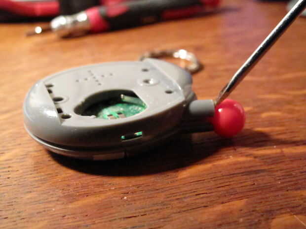 Ahora, abrir el lado de la caja (con el destornillador de cabeza plana) mediante la ficha en el medio (el que está resaltado por la luz azul). A continuación, levante el resto de caso abierto tirando desde la parte superior de la antena.