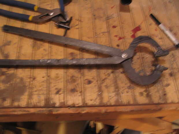Luego de hacer la fragua, al ir a usarla "en vivo y en directo" caí en cuenta de es indispensable tener una pinza apropiada. Las piezas chicas deben ser metidas entre las brasas para calienten, y luego es difícil extraerlas con una pinza común.E