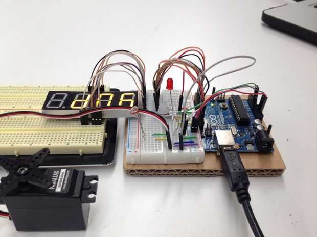 Este circuito está diseñado para ser utilizado con un obturador alejado infrarrojo. Esta había diseñado para una Nikon D3100, pero ningún otro DSLR con un mando a distancia debería funcionar igual de bien. En este circuito, un LED en la actualidad actúa como suplente para el obturador, pero adaptando para el obturador es sólo una cuestión de pasar por el botón en el mando a distancia y controlar con el Arduino. Puesto que es difícil decir cuándo un transmisor infrarrojo se activa, el display de siete segmentos parpadea cada vez que se toma una fotografía para informar al usuario de su progreso.