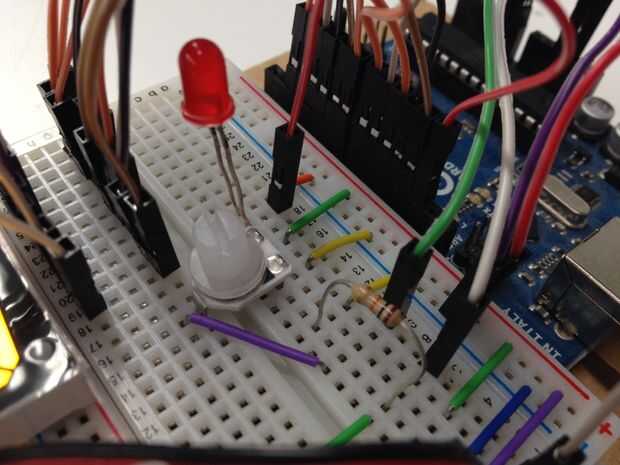Empezar por pasar los cables de puente de pines GND y 5V de Arduino a las bandas rojas y azules en el protoboard. Esto simplifica la construcción del circuito y libera algo de espacio en el Arduino.