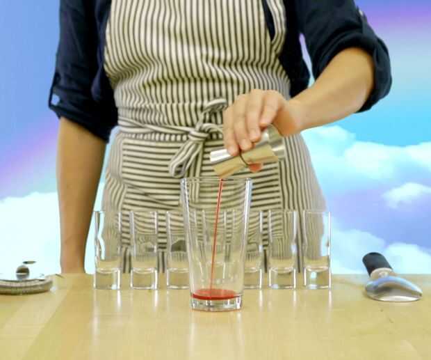 Mida 1/2 onza de granadina y vierta cuidadosamente en la parte inferior de la coctelera, teniendo cuidado de no llegar a los lados.