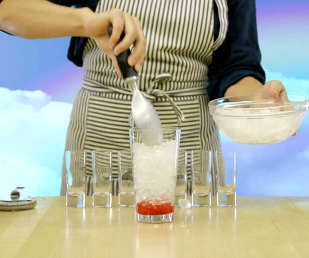 Suavemente agregar hielo a la coctelera hasta que quede 3/4 completo.