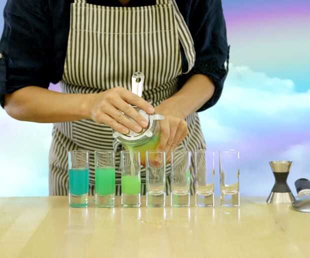 Tan pronto como el Curacao azul de agregado, retire la cuchara y coloque el colador de cóctel en la coctelera. Inicio verter las tomas derecho lejos del lado de la coctelera su añadido el Curacao azul para.