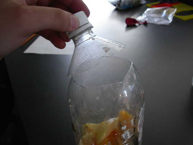 Me corte la parte superior de la botella de soda de plástico con un cuchillo afilado y había derramado en un recipiente. Simplemente puede verter la fruta fuera de la botella de nalgene a través de la amplia boca de la botella.