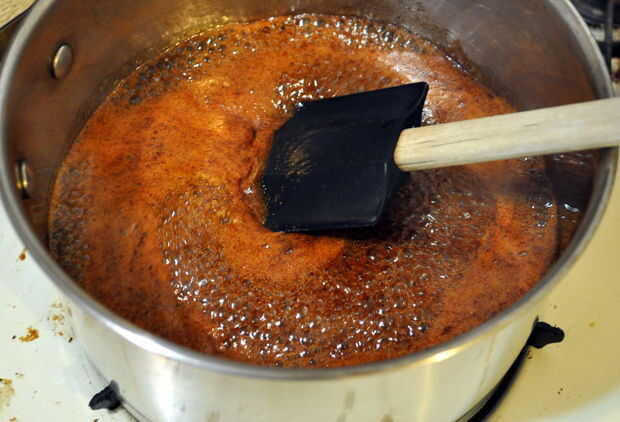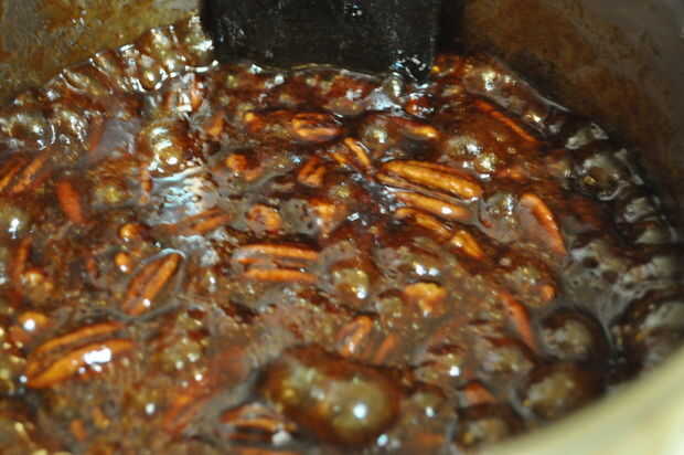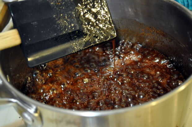 Tan inestable la estufa a fuego medio alto y se calienta la agitación del brazo es en para todo el ejercicio. Vas a llevar la mezcla hasta hervir. Una vez que las burbujas Inicio formando no vas a querer dejar de revolver o solo se puede quemar. Lo que estamos haciendo en este paso es hervir el líquido en el almíbar hacerlo espesar para arriba. Si nos fijamos en la primera foto puedes ver cómo pequeñas las burbujas son cuando las burbujas se hacen más grandes y la mezcla se pone más gruesa es el momento de añadir las nueces. Puede hacer referencia a la segunda foto para ver cómo gruesas dejó antes de agregar las nueces. Ahora no deja de agitación y en el siguiente paso.