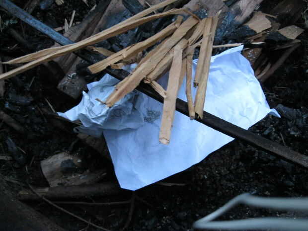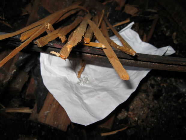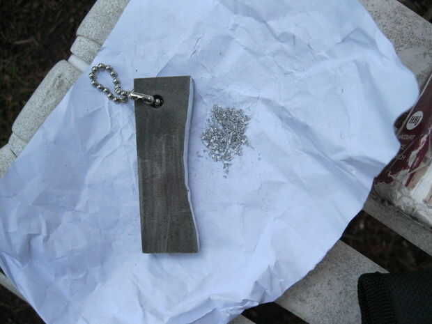 Ahora, es necesario raspar sobre una pieza de moneda de diez centavos de tamaño del magnesio de la varilla con el cuchillo (no preferido) o con un trozo afilado de metal. Concentrarlo en un pedazo de Yesca. Cuando se utiliza el magnesio, puede usar papel, cartulina, o cualquier cosa que se almacena fácilmente fuego (las patatas fritas? sí, cualquier cosa). Conseguirlo en la tienda de astillas y añadir más Yesca alrededor y un poco poco por encima de él.