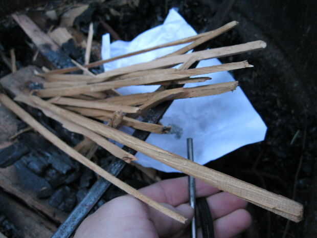 Una vez que la yesca es ahí abajo, haz tu barra de ferro y el delantero (puede ser cuchillo, astillas de roca u otro objeto punzante) y raspar la barra de ferro rápidamente, con el objetivo de sus chispas hacia la pila de magnesio. Usted notará que se quema muy rápidamente. Por esta razón sus materiales necesarios para estar cerca.