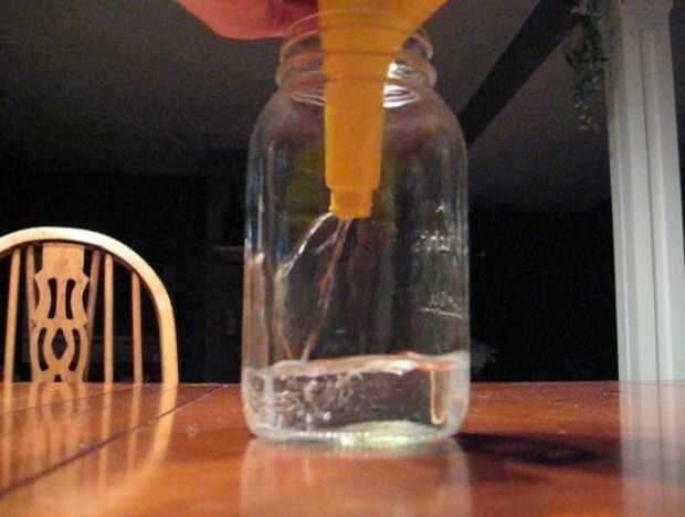 Tomar un frasco de vidrio y llenarlo con líquido anticongelante, HEET. Llenarlo con la cantidad que cree que utilizas, porque si trata de almacenar este material simplemente se evaporan! Tomar una cucharada de ácido bórico y añadir a los restos del anticongelante. Despertar bien y asegúrese de que todo el polvo se disuelva. Esto es todo! Solo dejarlo reposar unos segundos dejar que se disuelva totalmente. Ahora estamos listos para mi paso favorito, jugar con el fuego verde!