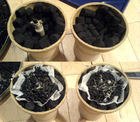 Luego corte dos pedazos de papel de tejido, uno de ellos con un agujero para pasar el tiempo fusible o spolette. Poner las piezas en cada hemisferios contra las estrellas y cuales se llenan de carga estalló en el borde. Se añade un poco de "booster", como el silbato de mezcla o polvo de destello en el centro de cada hemisferio y en la carga de la ráfaga con los dedos. No debe ser usado, máximo 1g.