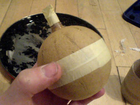 Rápido encaje a presión los hemisferios dos shell juntos. Esto no es tan difícil como parece, pero si se hace demasiado lentamente, la estrellas ráfaga carga podría reorganizar o caerse, y los pasos anteriores necesitará ser repetido. Si la llanta cada papel hemisferio toque entre si en este punto, la cáscara es underfilled. Sin embargo si se hace correctamente debe haber un pequeño espacio de alrededor 1 cm en el Ecuador. Colocar la cáscara en el lado del soporte de fusible de tiempo abajo y usar una clavija de madera para golpear suavemente el hemisferio superior en diferentes lugares. Las estrellas entonces los arreglos dentro de la cáscara y esperemos que los dos hemisferios llega a unos de otros. Sellar alrededor del Ecuador con cinta adhesiva para cerrar temporalmente el shell. También poner un trozo de cinta adhesiva alrededor del extremo del fusible de tiempo o spolette para proteger contra el daño durante los próximos pasos.