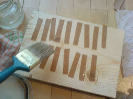 Para hacer su pega tiras pegajosas antes de pegar le tendrá que añadir un pegamento para cada tira de papel kraft de 70 x 15 mm en un lado. Esto puede hacerse rápidamente arreglando unas tiras en una mesa amplia de madera. A continuación aplicar un fino, incluso capa de trigo pasta con un cepillo. Estas tiras están ahora listas para pegar, pero usted tendrá que repetir este paso varias veces, ya que usted tendrá un montón de tiras para completar su cáscara.