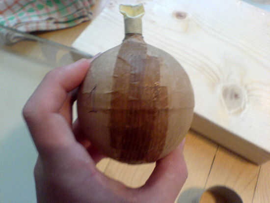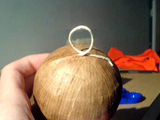 Pegar la cáscara, cortar un trozo de 8 cm de algodón guita y hacer un bucle sobre ella. Caliente pegamento en la parte superior de la concha (los hemisferios enfrentadas del con un fusible de tiempo en ella) y pegar como antes, sólo la tira de la cuerda. Esta cáscara es necesario 10 capas de pegar (= 20 capas) para completar. Lo ideal es hacer que la cáscara ~ 5 mm más pequeño que el tubo del mortero, en este caso el OD de la cáscara debe ser ~ 7 cm. lo que es este diámetro puede tomar horas para principiantes completar. Después de las capas de pegar, deje la cáscara secar completamente.