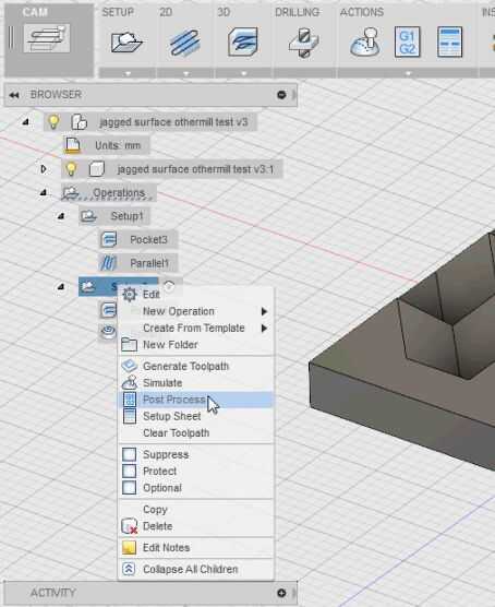 En el lado izquierdo de la pantalla, debajo de la barra de herramientas, habrá un bloque que dice, "Setup1". Por debajo, habrá bloques que describe las diferentes trayectorias que se han generado. Si ha elegido el mismo bit para las operaciones de desbaste y suavizadas, luego haga clic derecho en el bloque de configuración y elija "Postproceso".