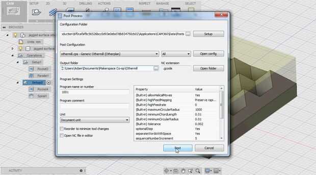 Esto hará que aparezca un cuadro de diálogo. Configuración del Post hay un menú desplegable. Seleccione "othermill.cps - Othermill genérico (Otherplan)". Usted puede elegir una carpeta de salida por debajo de eso si quieres que también. Haga clic en el botón "Post" en la parte inferior de la caja de diálogo y guardar el archivo.