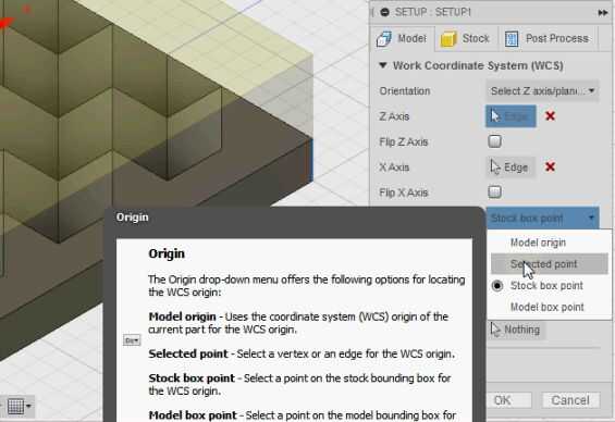 Haga clic en volver a la ficha haga clic en la casilla "Origen" del "Modelo" y utilice el menú desplegable para elegir el "Punto seleccionado". Luego debe seleccionar un punto en el modelo a la mayor altura de Z e idealmente tan cerca la esquina como sea posible.