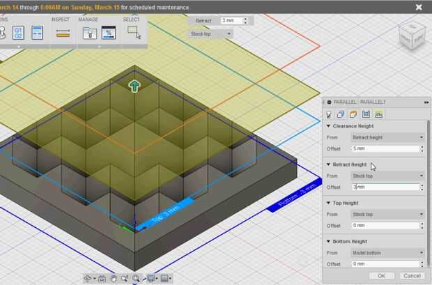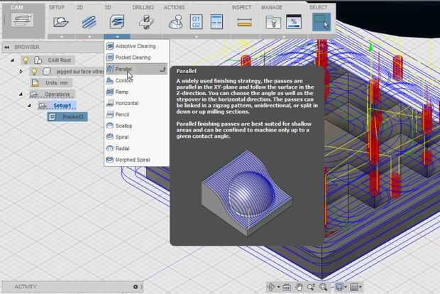 Haga clic en la flecha hacia abajo en el botón "3D". Hay nueve opciones para el desbaste pasa: URL, contorno, rampa, Horizontal, lápiz, Vieira, espiral, Radial y espiral transformado. Otra vez, fusión 360 mostrará cuadros emergentes con descripciones para cada una de las opciones para que puedas elegir lo que es mejor. He encontrado que Claro paralelo es muy simple y da buenos resultados. Un cuadro de diálogo en la parte derecha de la pantalla otra vez con cinco pestañas: herramienta, geometría, alturas, pases y vinculación. Utilizaremos tres de estos.