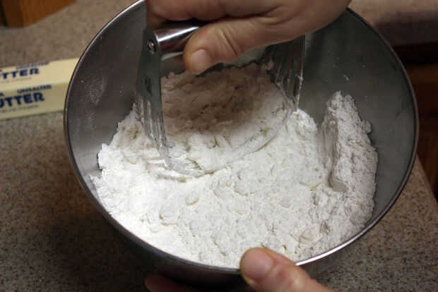 Batir los ingredientes secos, luego la mantequilla y manteca hasta que queden trozos del tamaño de guisante de la grasa.