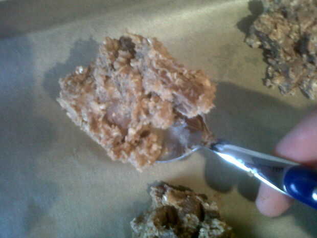 Colocar la cucharada tamaño mezcla en la bandeja para hornear y aplanar con un tenedor.