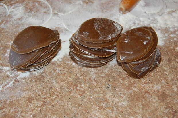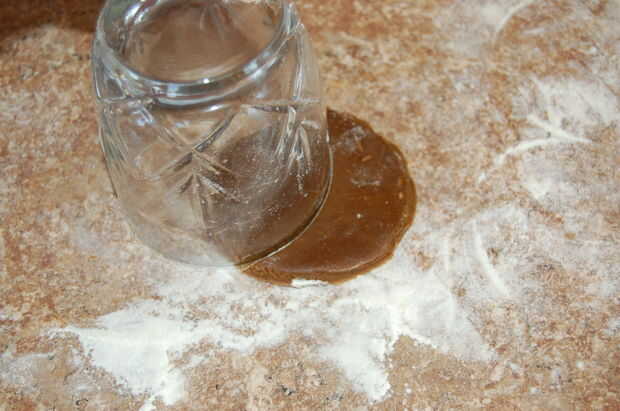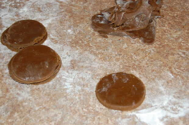 Con un cortador de galletas redondo (o un vaso, si no tienen ni siquiera una de esas... o no estaba seguro que tuyo fue o si se fue a lavar, que era mi caso) cortar algunos círculos. Luego tomar el cortador de la galleta y colocar la mitad sobre el círculo. Presione hacia abajo y ahí lo tienen! Galletas de forma de fútbol.