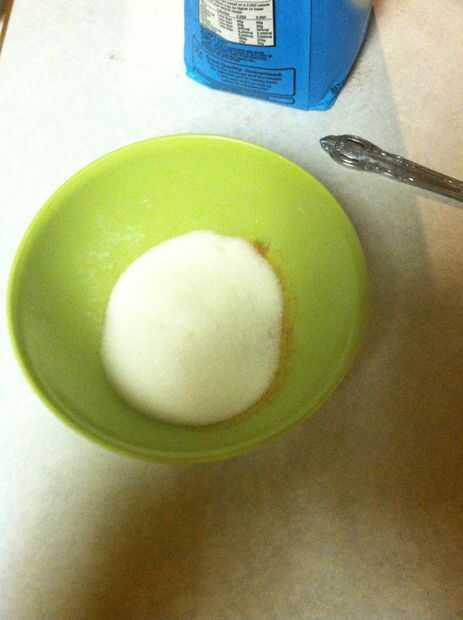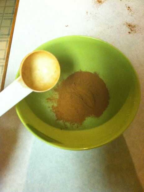 1) verter 1 cucharada de canela en un recipiente pequeño 2) Añadir 3 cucharadas de azúcar de caña puro a la canela 3) mezclar con una cuchara, batidor de alambre, etc..