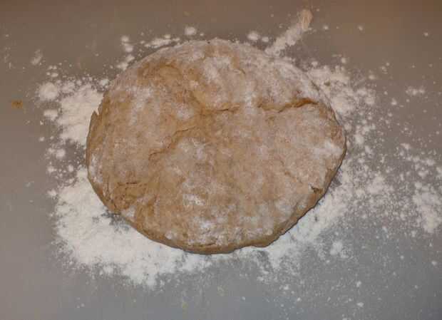 1. Espolvorear harina blanca sobre una tabla de cortar y poner la bola de masa encima de la harina.