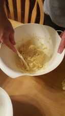 • Con una espátula de goma, raspe los lados de la ensaladera para reunir cualquier masa callejero al centro. Divida la masa por la mitad con una espátula. Poner una mitad de la masa en uno de sus cuencos de cereales pequeños y mantener la otra mitad en la mezcla grande del tazón de fuente.