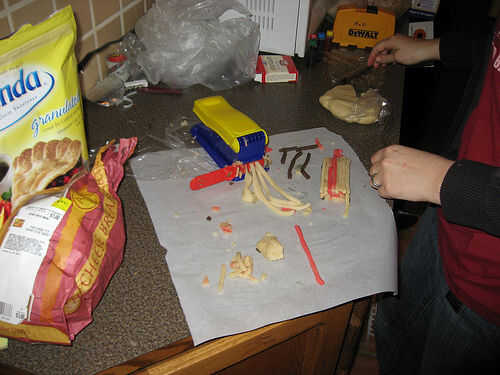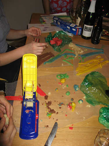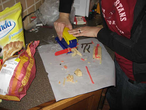 Para este paso, usted necesita un estirador de Play-doh. Conseguimos nuestro objetivo por unos 5 dólares. Tienen diferentes opciones que puede ajustar deslizando una plantilla poco hacia adelante y hacia atrás. Seleccione el conjunto de cuatro cuadrados de 1/4 de pulgada y conseguir exprimir! (Usted podría ser capaz de hacer algunas interesantes rollo de galletas con las otras plantillas, también)